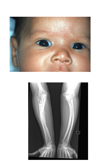 ○Frequent fractures, blue sclera, thin soft skin, short stature, hearing loss, delay in walking- loss of collagen