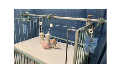 Under 3 less than 25 lb- flat on bed but legs up at 90- flyant traction- femur or hips