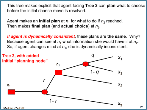 At any choice node, the agent’s choice matches what they would choose at the initial node of the tree obtained by “snipping off” the sub-tree at the choice node from parts of the original tree not reachable from the sub choice node