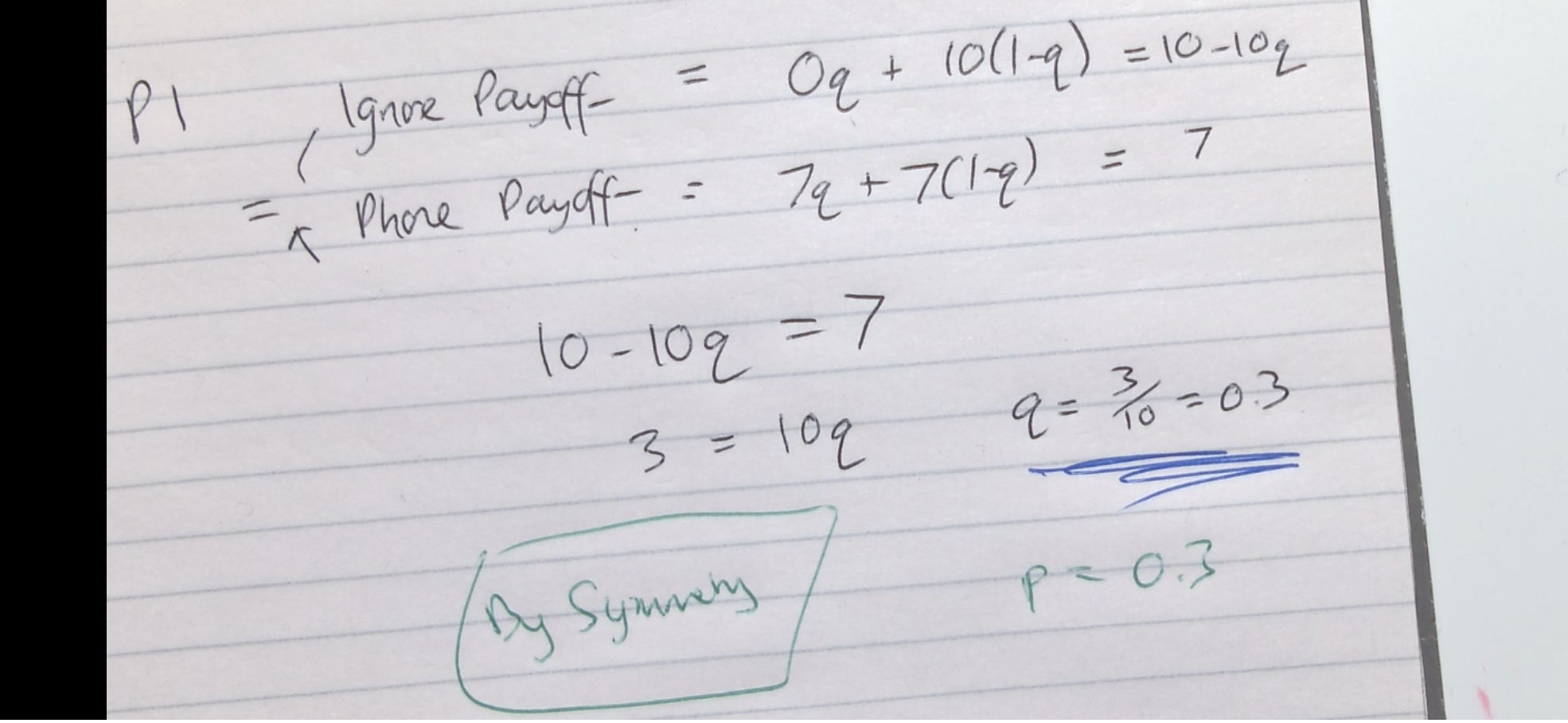 Explanation: Player one is indifferent to whatever player 2 chooses, so we are looking at the probabilities on the first line. I will get 0, given the probability that player two selects ignore as well, and then I will get 10, given that player 2 phones the police