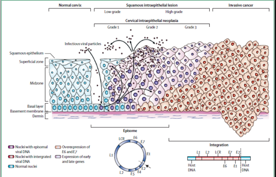 In early infection, HPV DNA is episomal (circular). In cancer, HPV DNA integrates into the host genome, leading to permanent, high-level expression of E6 and E7.