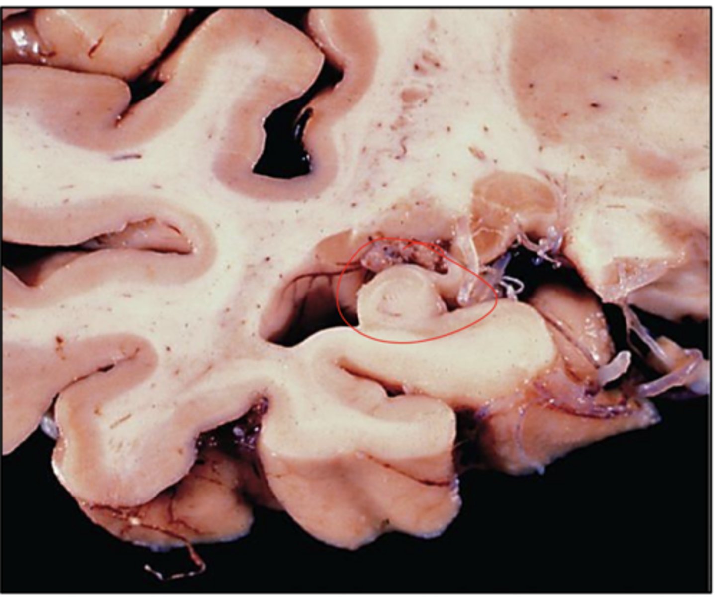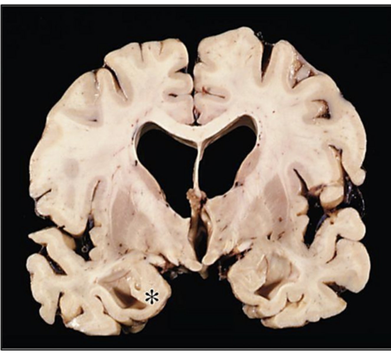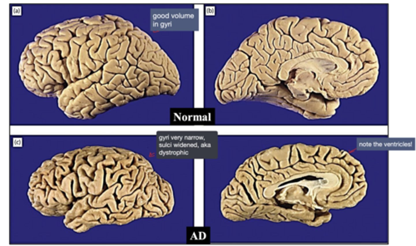 AD -> characteristic atrophy of the entorhinal cortex is seen, with resultant dilation of the temporal horn of the lateral ventricles