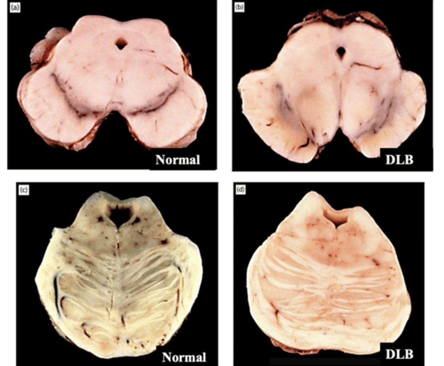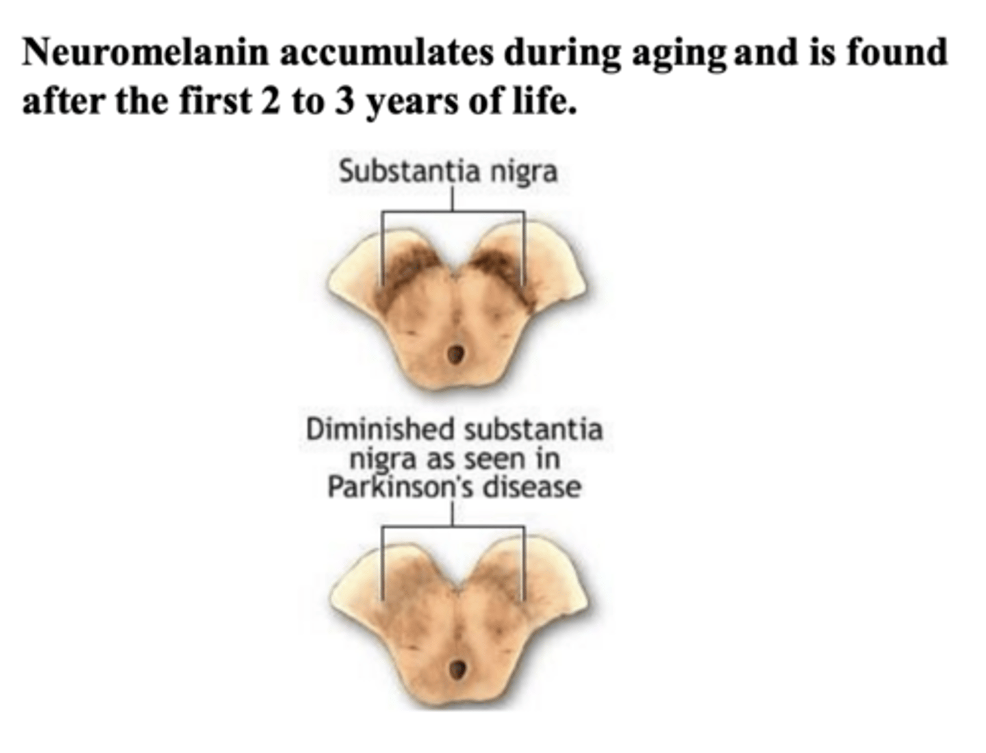 hypopigmentation of substantia nigra (top) and hypopigmentation of locus coeruleus (bottom)