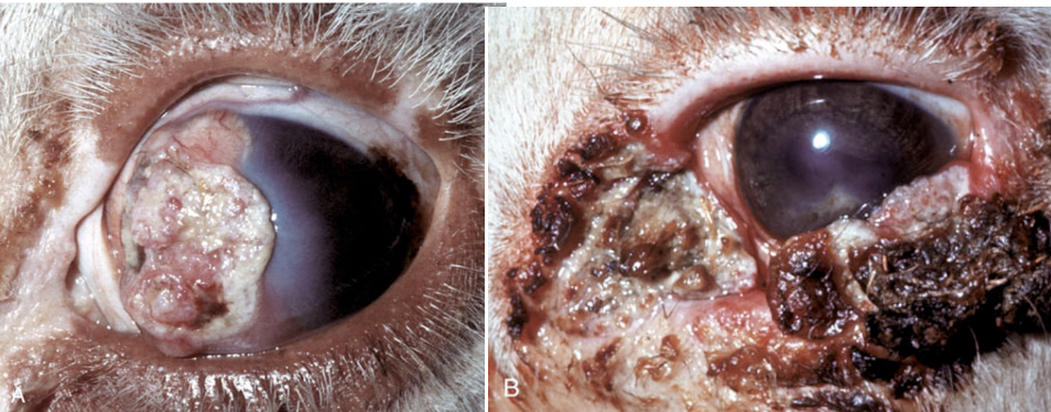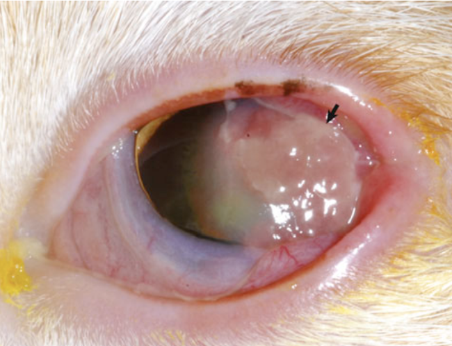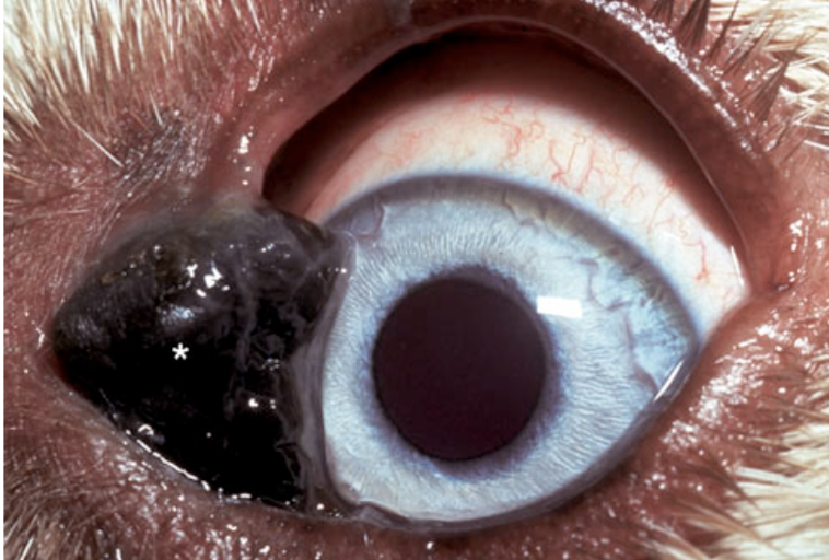 corneal sequestrum, most often occurs in cats after chronic ulceration