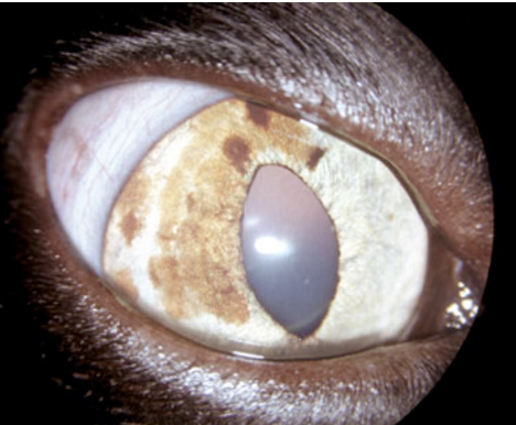 focal or multifocal to coalescing regions of iris hyperpigmentation which coincides with collections of neoplastic melanocytes