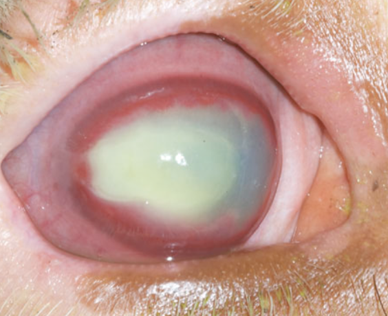 neutrophils fom the tear film release lytic enzymes which results in necrosis/malacia of the cornea, can progress rapidly and esult in descemetocele and/or corneal perforation