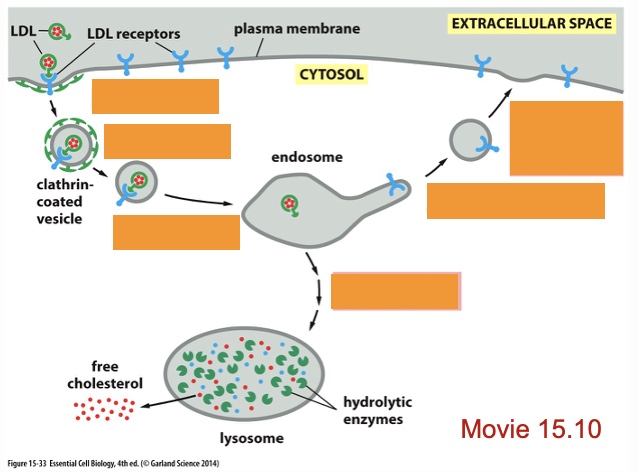 protein of cholesterol recognized by LDL receptors in plasma membrane, adaptin (adaptor molecule) binds to tail of LDL receptor that protrudes into the cytosol, adaptin recruits clarithin which starts coating the membrane, assembly of the clarithin coat causes the membrane to bend inward forming a vesicle that buds off inside the cell taking with it cholesterol, once inside cell vesicle uncoats and fuses with endosome, endosomes low pH causes LDL receptors to release their cargo, (empty LDL receptors are recycled: bud off and return to membrane), endosome fuses with lysosome and LDL particles disassembled, free cholesterol is released to be used in synthesis of new membranes