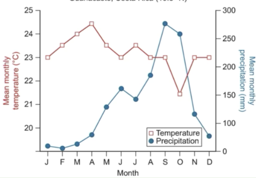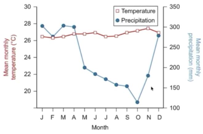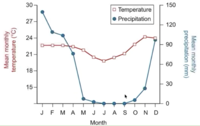Tropical Dry Forest, always warm, precipitation reaches 0