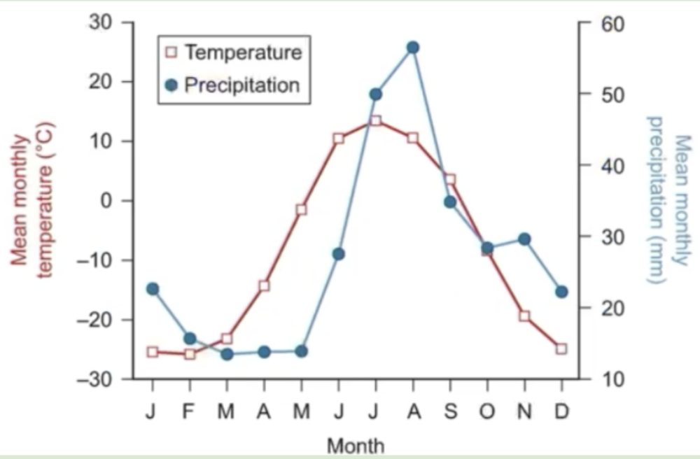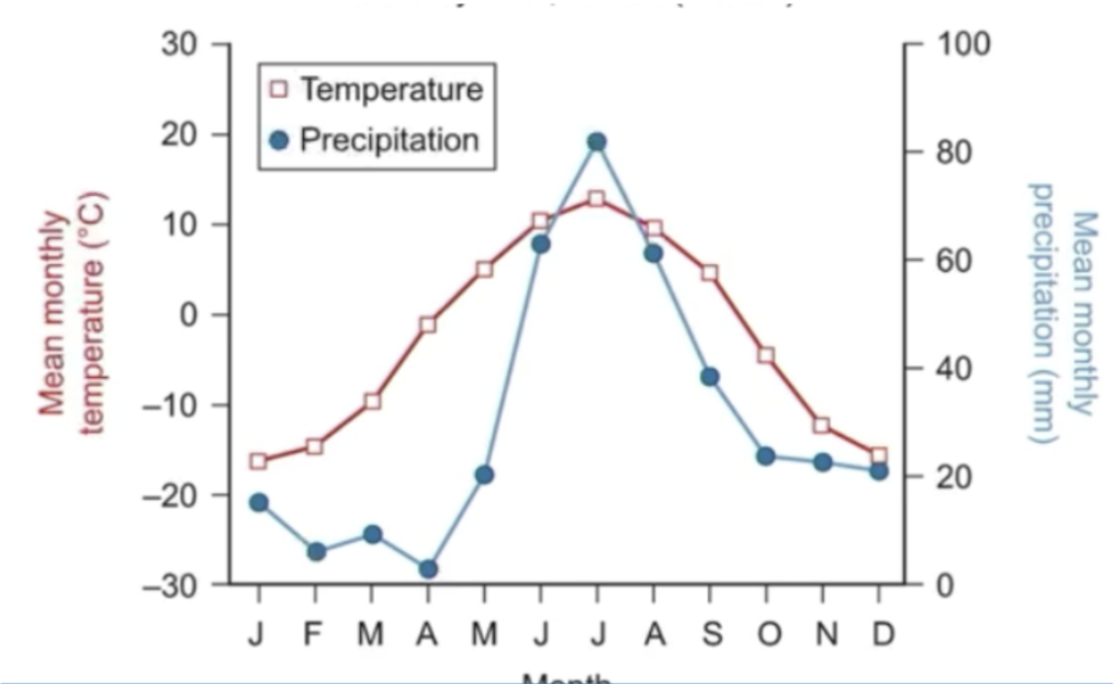 Not always warm (not tropical), has coldest winter (-30 deg C)