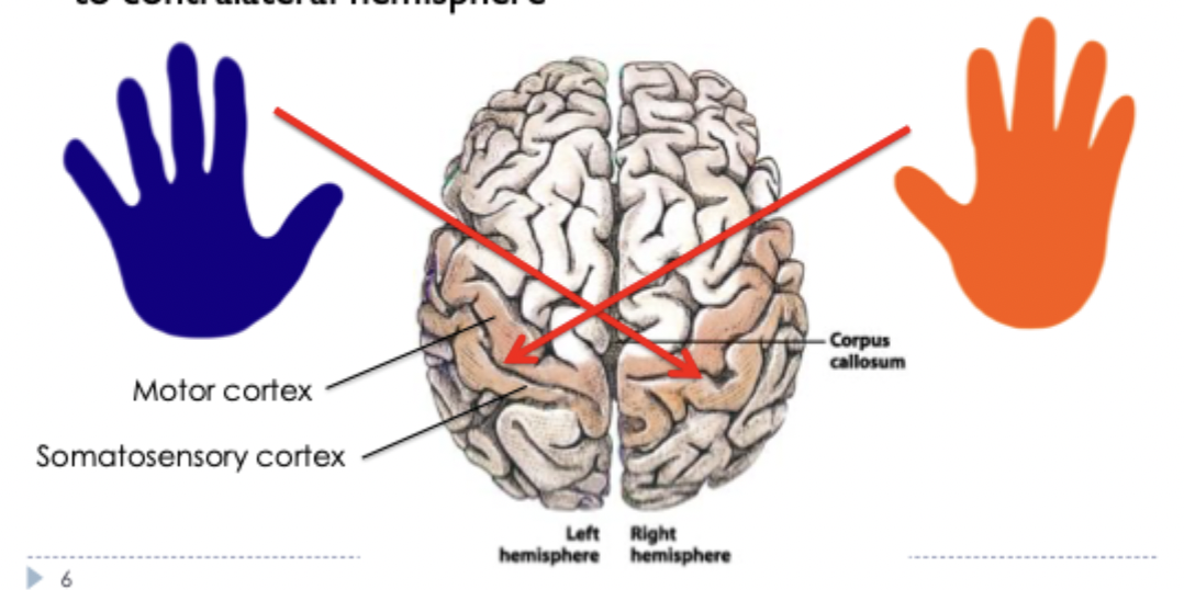 sensory input & motor control of one side of the body are linked to contralateral hemisphere