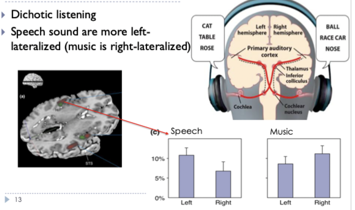 speech sounds are more left lateralised (right ear) and music is right lateralised (left ear)