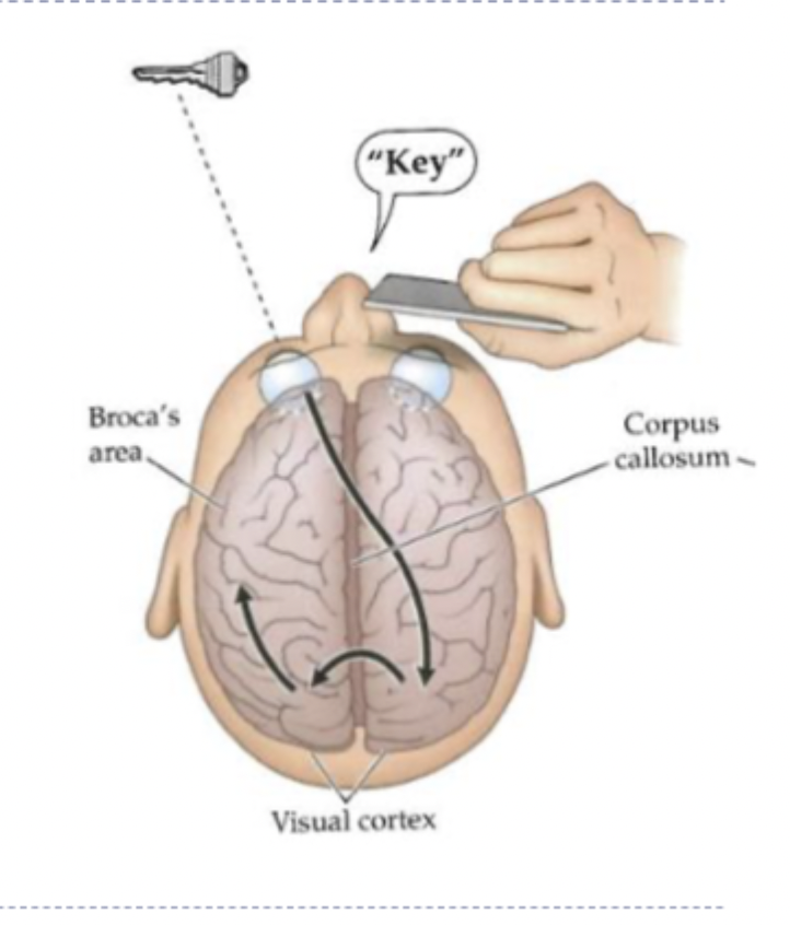 The LVF in contrast projects directly to the RH, so naming is slower when the information has to be shared across the hemispheres via the corpus callosum, as represented in the image.