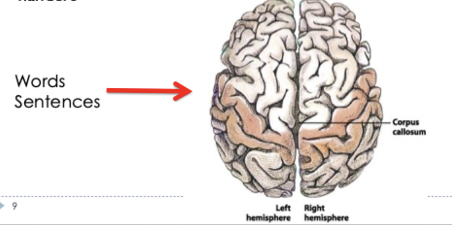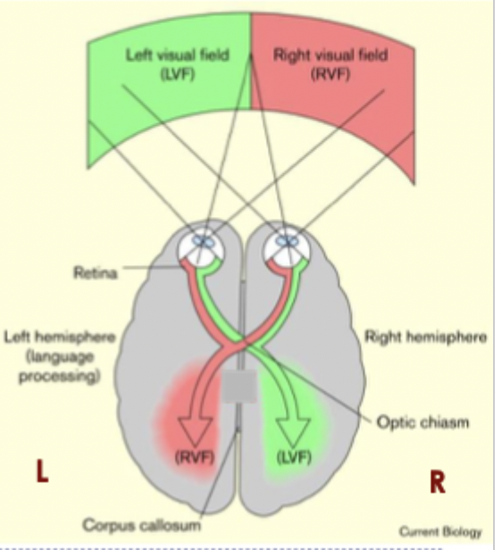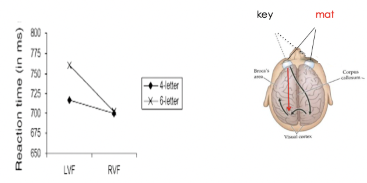for reading, anything presented in right visual field will get to left hemisphere faster then words presented to left hemisphere