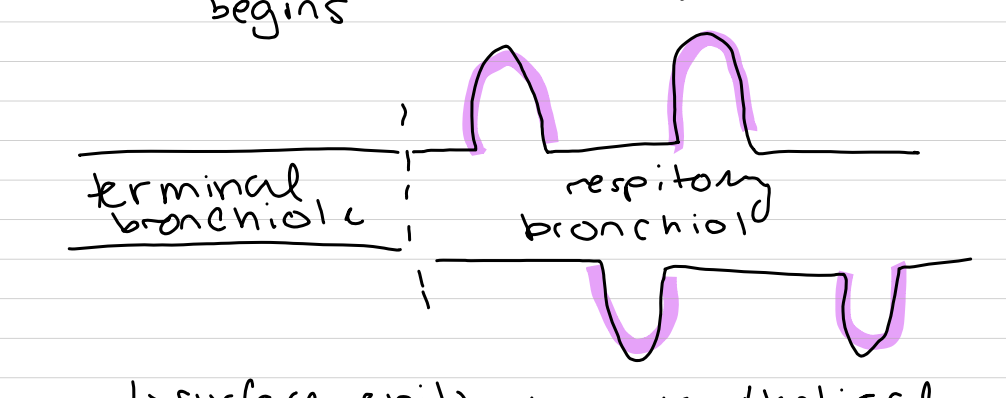 where the respiratory region begins, surface epithelium is identical EXCEPT alveoli are now present (which are expansions of the airways colored in pink below)