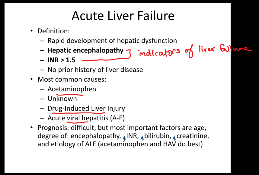 Encephalopathy + INR >1.5 + no prior liver disease.