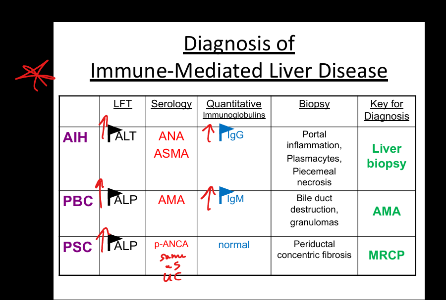 ALP elevation (cholestatic). AMA ≥1:80. Bile duct destruction