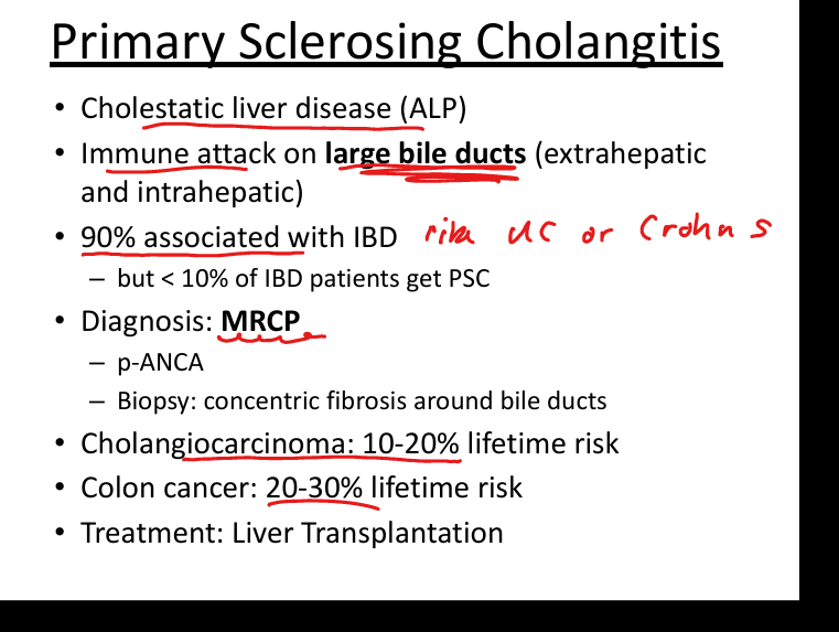 Cholestatic LFTs in a patient with IBD. Diagnose with MRCP. Complications: Cholangiocarcinoma (10–20%)