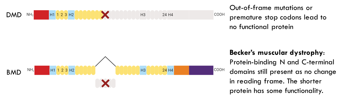 •Becker's muscular dystrophy caused when shorter protein is expressed leads to milder symptoms