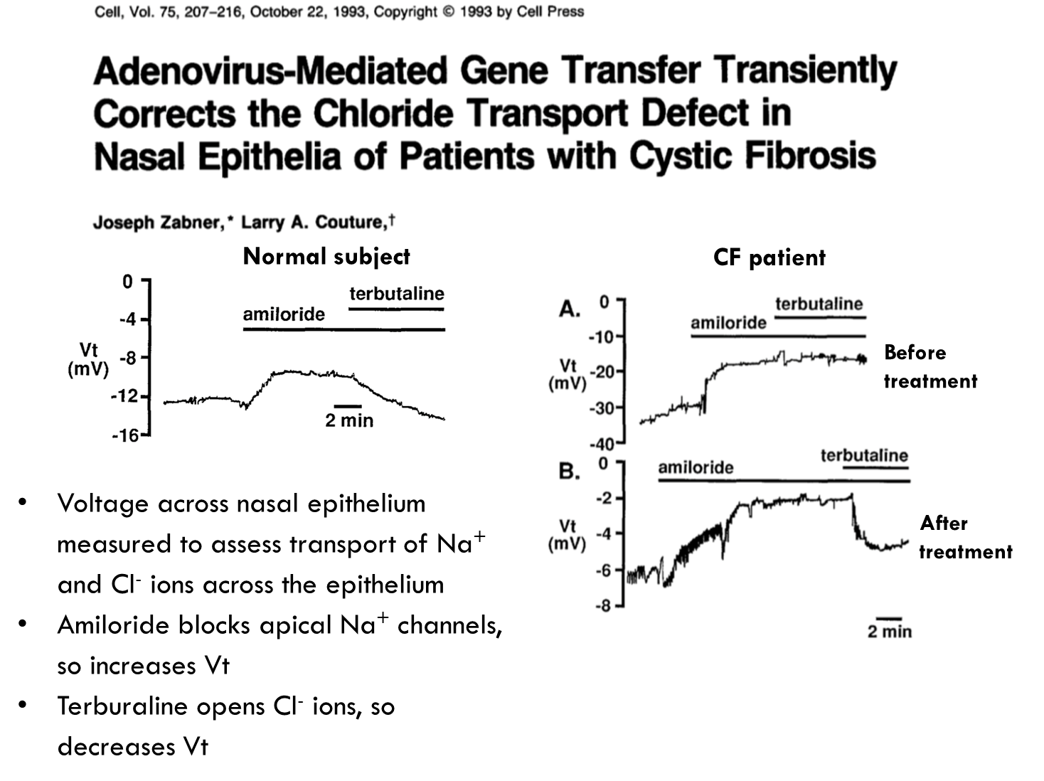 They saw how much of the CTFR was being expressed by looking at the voltage across the nasal epithelium, so they could see how much sodium ions etc were getting transported across the nasal epithelium. Amiloride was used to block sodium channels to increase voltage and terbutaline to open chloride ions and therefore decrease the voltage. When done with CF patients before treatment the amiloride causes voltage increase but when given terbutaline it doesn’t cause a decline. After treatment they found they could restore a decrease in voltage suggesting these patients could restore this decrease in voltage.