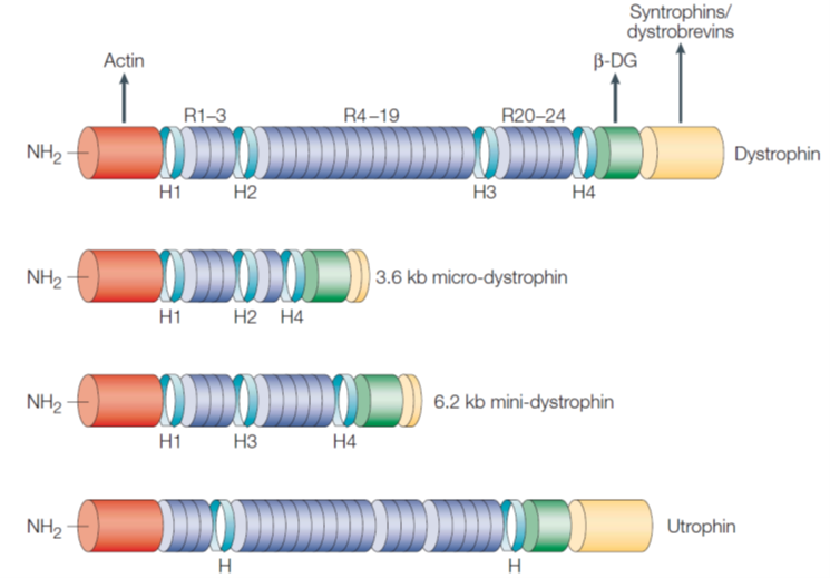 •Micro- and mini-dystrophin can be genetically engineered where the rod domain in the middle is deleted. Key protein binding domains are still retained.