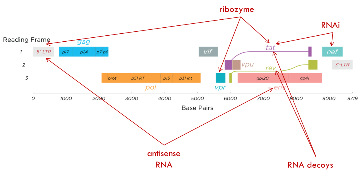 RNA based therapies target various parts of viral genome e.g. antisense RNA to target the envelope protein and 5 prime LTR which is very important for gene expression. We can also have ribozymes that target the 5 prime LTR as well or VPR or TAT. Just look at the diagram