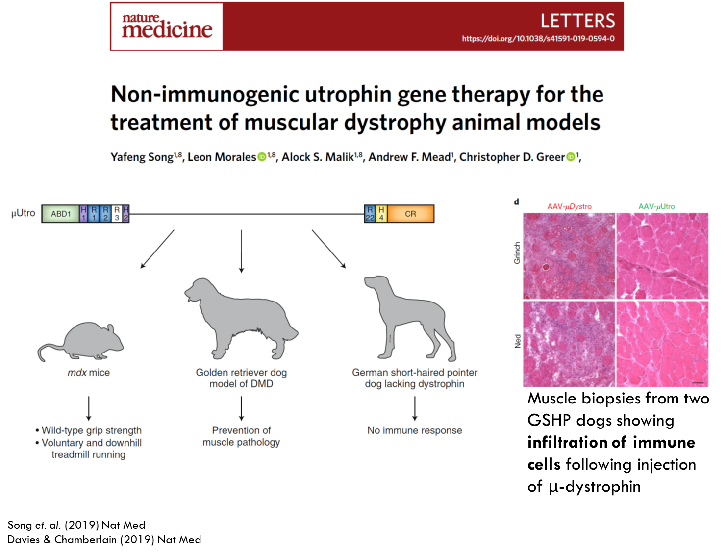 Genetically engineered utrophin to make it even smaller and inserted it into the HIV vector and tested it in 3 models. In the mouse model there was an increase in muscle strength. The same happened with the golden retriever dog model. German short haired dog model was used to looks at immune responses. This model had complete deletion of dystrophin. Therefore any small amount of expression of dystrophin could activate the immune response. Purple dots indicate immune cells and when using micro utrophin they saw very little immune response.