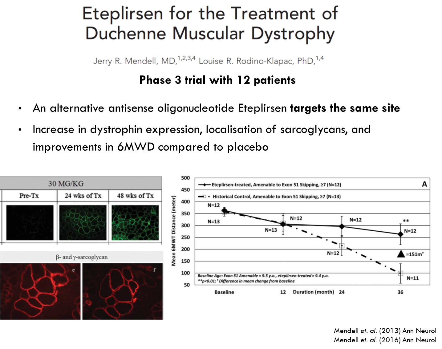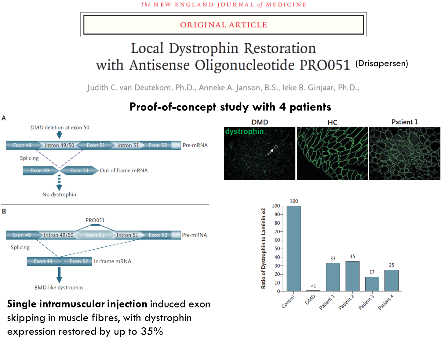 These patients had deletion in exon 50 → non functional dystrophin. Used antisense oligonucleotide which targeted splice site in exon 51. This leads to it being skipped. You get splicing of exon 49 to 52 which produces a shorter dystrophin protein. Can only be used for the percentage of patients who have deletion in exon 50.