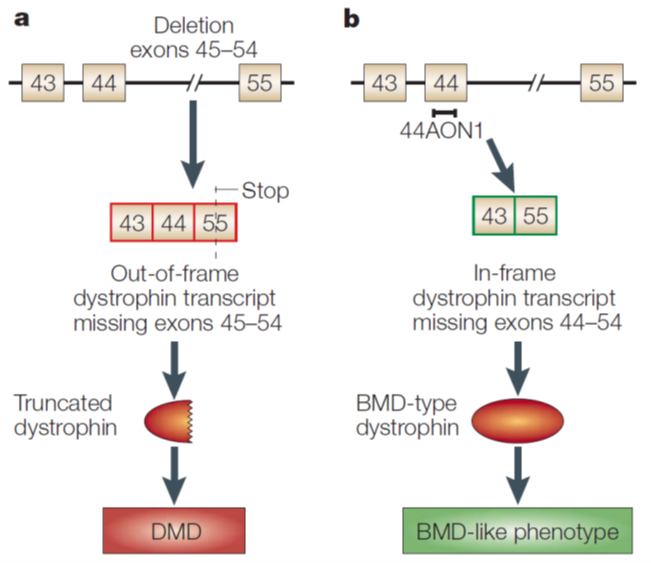 Here from 45 to 54 there is a deletion causing an out of frame mutation leading to DMD in mice. However when you add antisense oligonucleotide (44AON1) to exon 44 it is skipped and therefore exon 43 splices to the next available exon which is 55. This leads to a protein that is shorter. → Beckers muscular dystrophy like phenotype