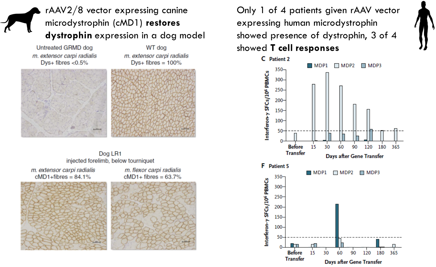 In the dog it seemed to restore function of dystrophin. However 1 in 4 patients had this same response while 3 in 5 had a t cell response where interferon gamma was being produced. This suggests that this is potentially killing the cells expressing the protein → immune system is recognising vector or the protein as foreign molecule.