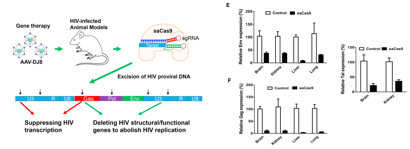 Multiplex single-guide RNAs and Cas9 directed against HIV-1 genome delivered to humanised mouse model by intravenous injection of AAV vector