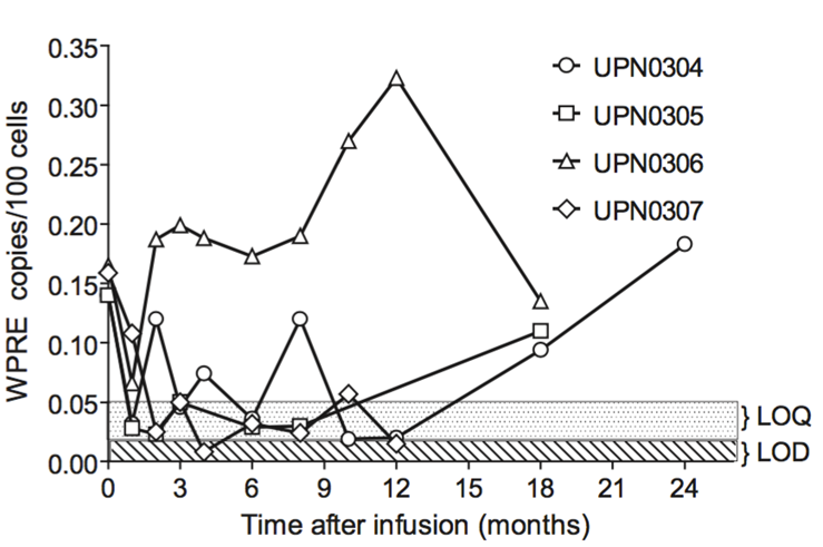 Integrated vector copies, siRNA and ribozyme levels detected in patients to varying degrees for up to 24 months