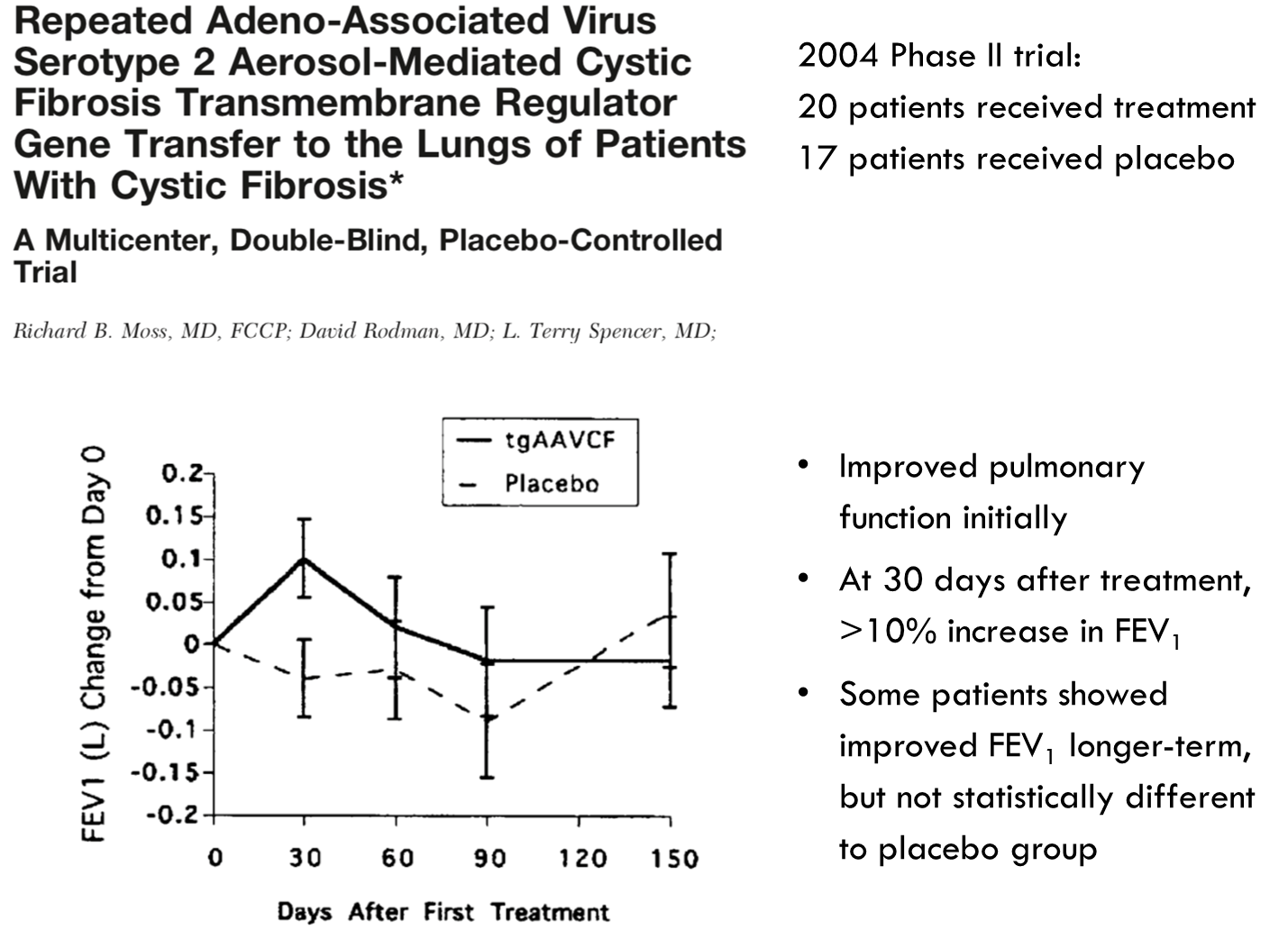 •Two studies in 2004 and 2007 tested repeat-dosing of AAV vector containing the CFTR gene, delivered to the respiratory tract by inhaler