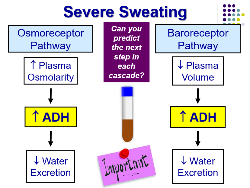 Sweating removes dilute fluid (hypoosmotic), causing ECFV to decrease and the osmolarity of body fluids increase