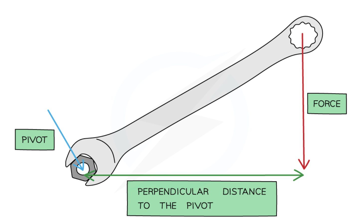 Diagram of turning effect of force exerted on spanner: