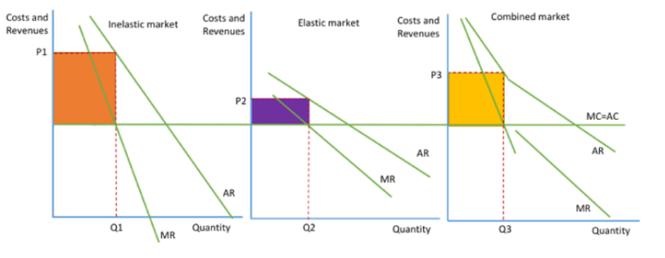 The diagram shows the separate markets for separate groups; those with elastic demand and those with inelastic demand