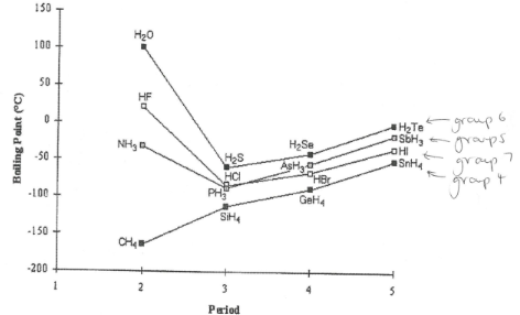 Trend as you go down groups (from period 2 to 5) is an increase in boiling point due to an increase in van der waals forces between molecules. NH3, HF and H2O do not fit trend as they also have much stronger H bonds between their molecules