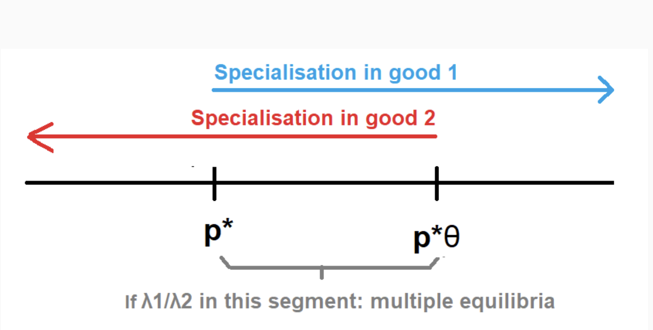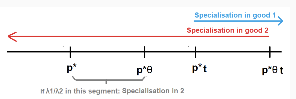 Hence, complete specialisation in good 1 is an equilibrium if and only if p* <= λ1/ λ2