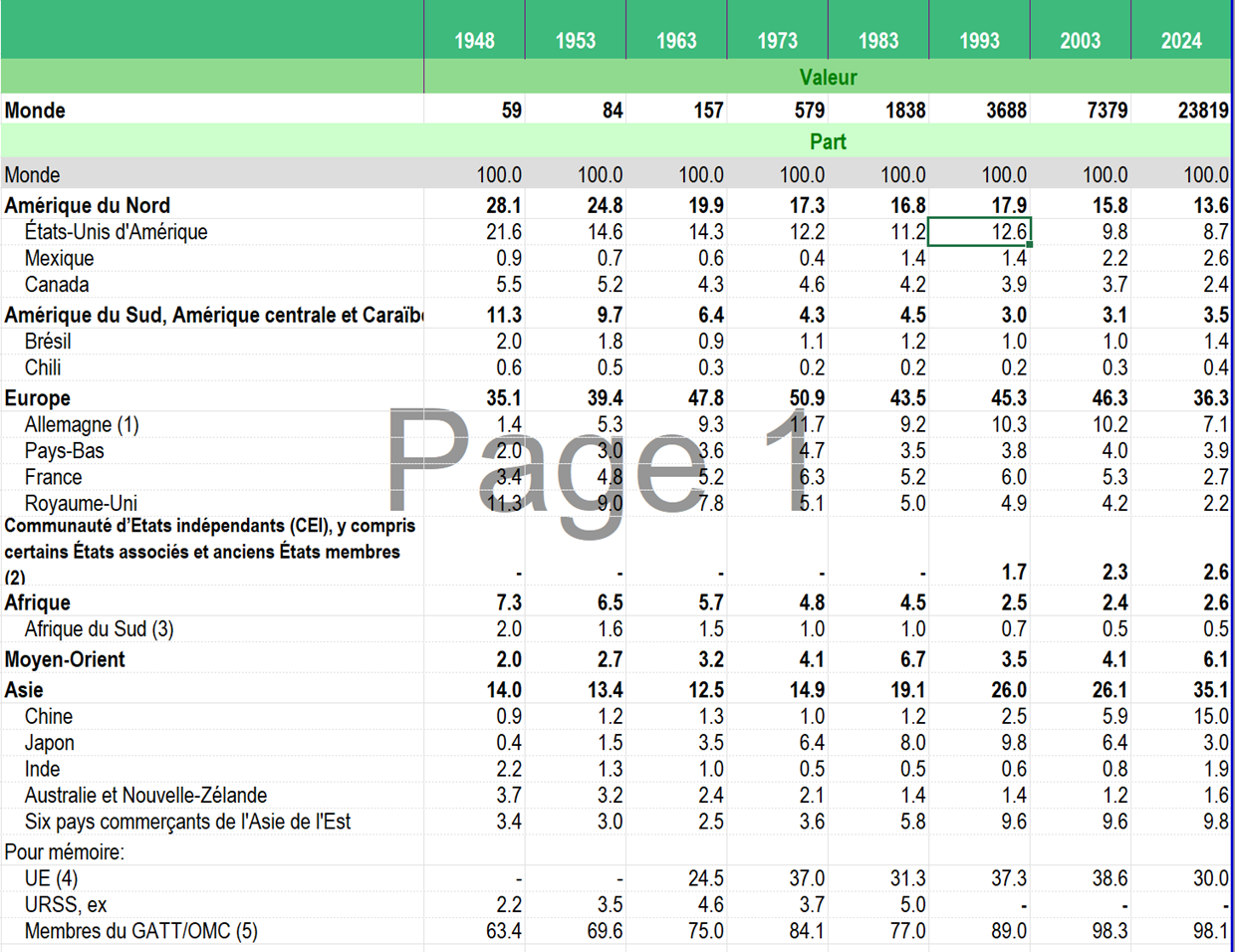 Commerce international : UE et USA sont les deux piliers du commerce mondial : 72% des échanges impliquent l’un ou l’autre de ces pays (commerce entre le reste du monde = 28%). Deux agents avec un poids très important