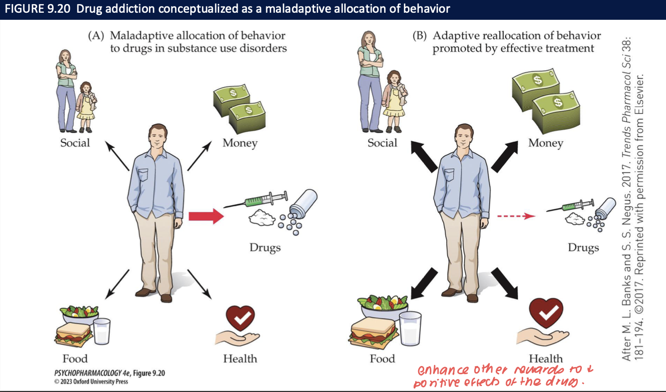 It reallocates behavior toward alternative reinforcers, countering delay discounting and competing with drug reward.