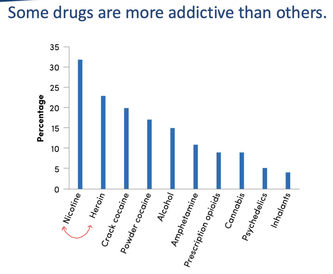 heroin, alcohol, nicotine most addictive → caffeine, hallucinogens, cannabis least addictive