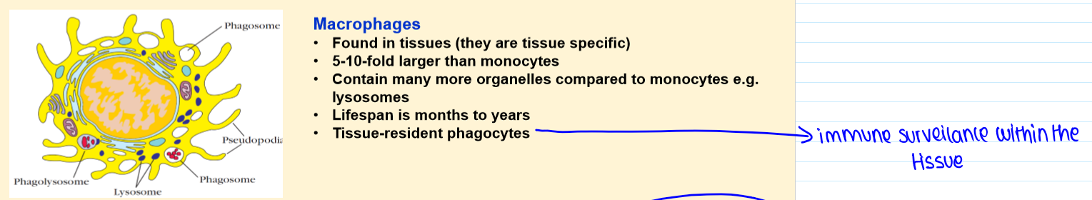 Motile phagocytic cells that can migrate from the blood into the tissues; majority are located in tissues