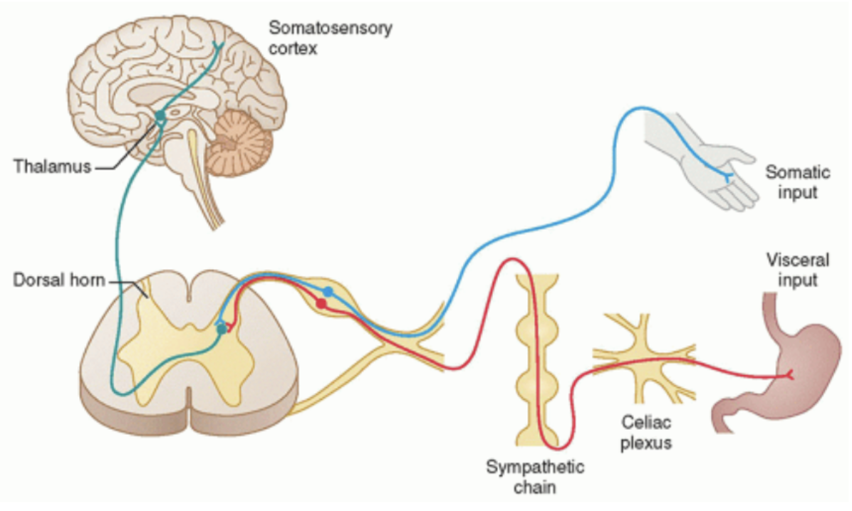 Visceral pain afferent fibers detect distention and pain, however, the pain is generally dull and poorly localized