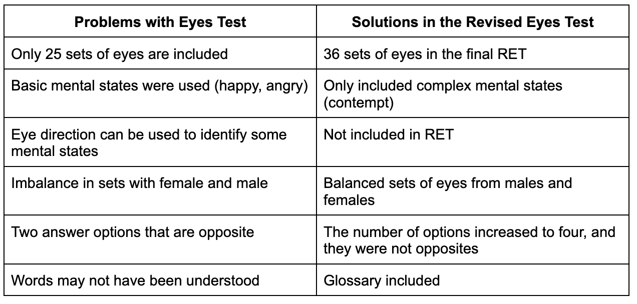 validity: due to changes made to the Eyes test- 4 options, equal female and male eye pairs shown, glossary provided to Ps