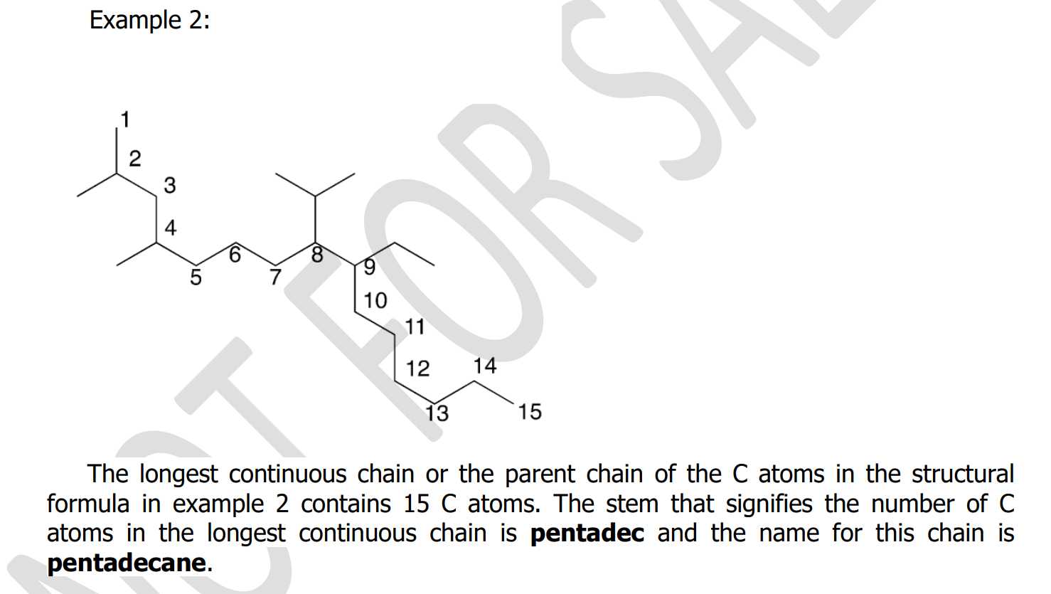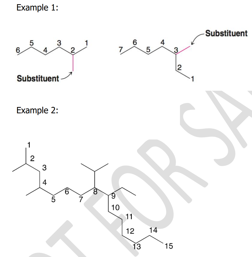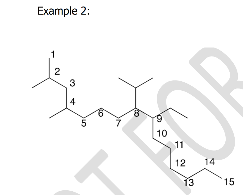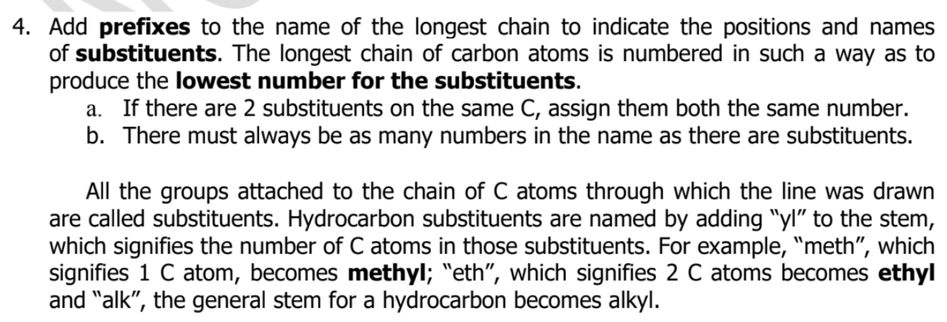 3. Identify the ____________ chain of carbon atoms in its structure. Complex alkanes are named by using the __________ continuous chain of C atoms as the basis of the name. If there is no longest chain because two or more chains are the same longest length, then the parent chain is defined as the one with the most ___________.