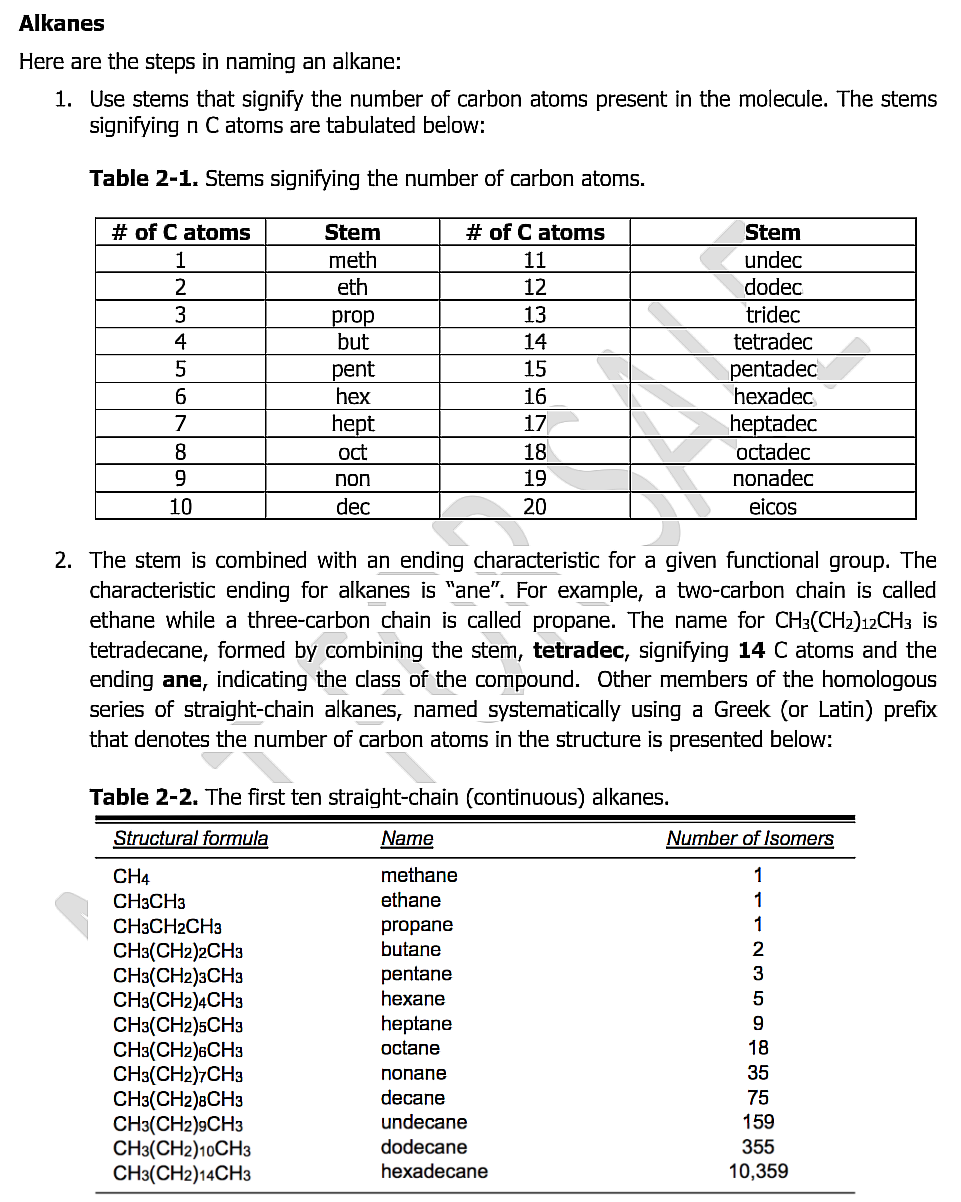 What is the name of the first 10 carbon container compounds (Alkanes). From 1 carbon to 10 carbons.