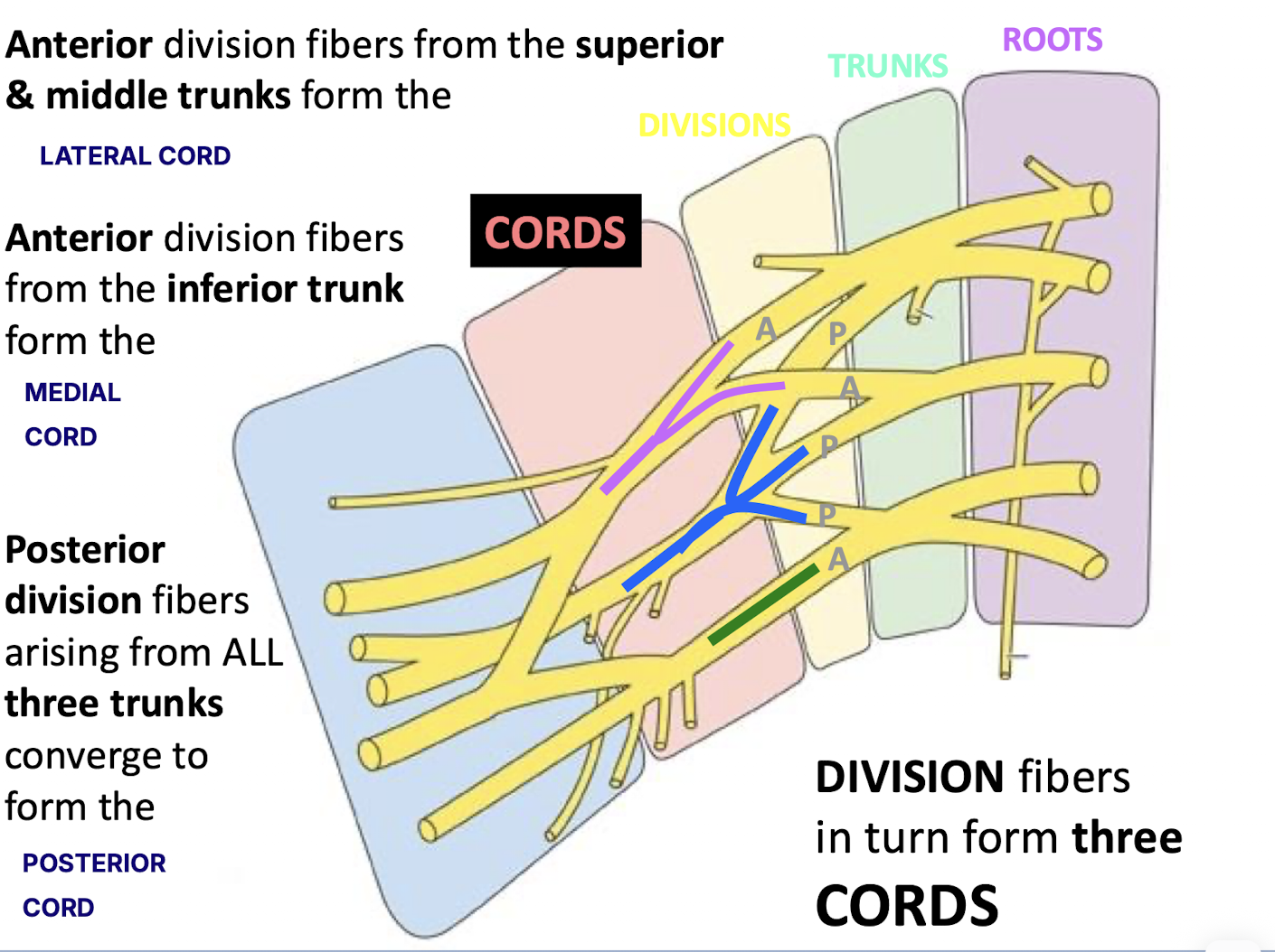 How are the lateral, medial, and posterior cords of the plexus formed?