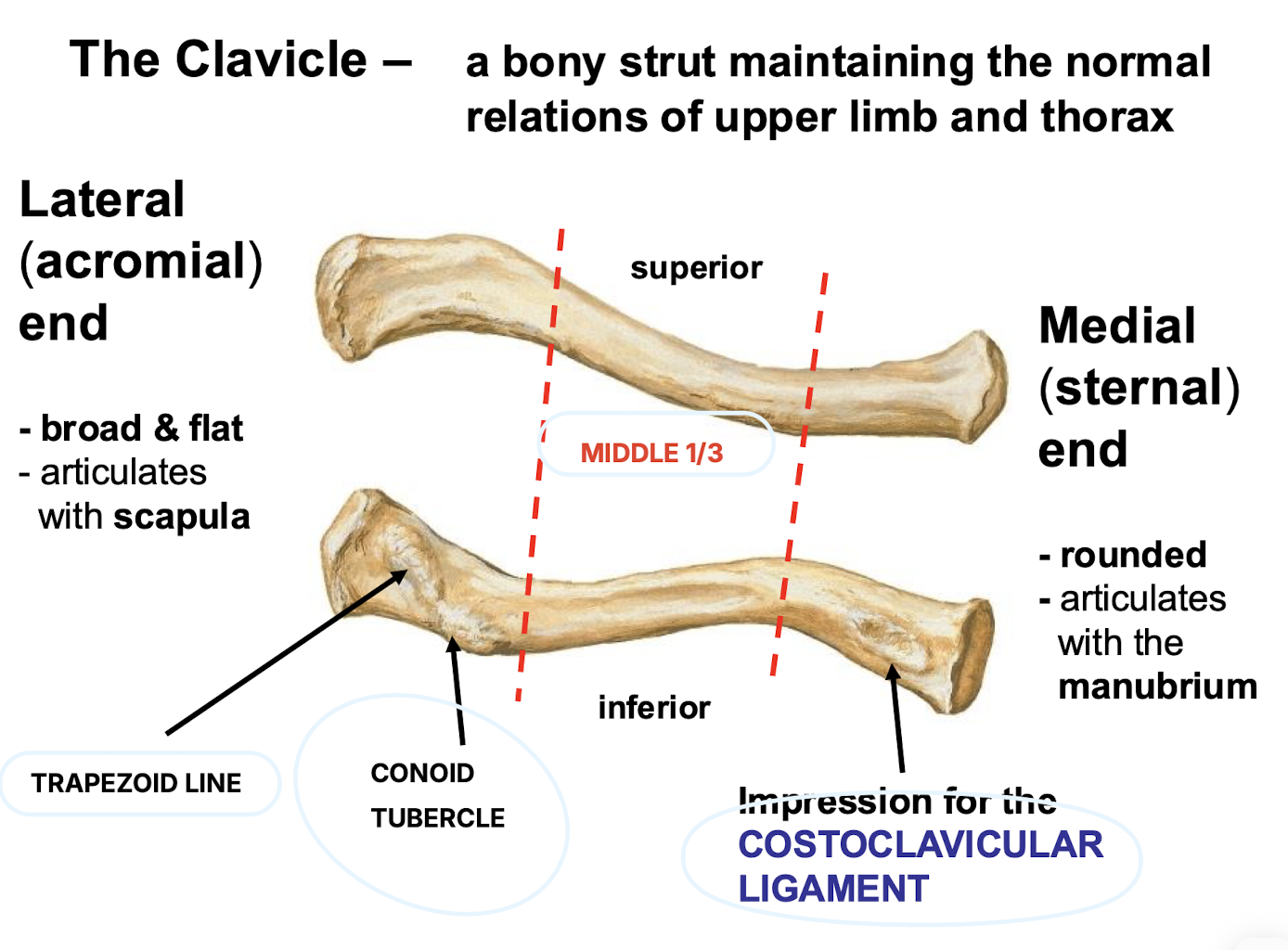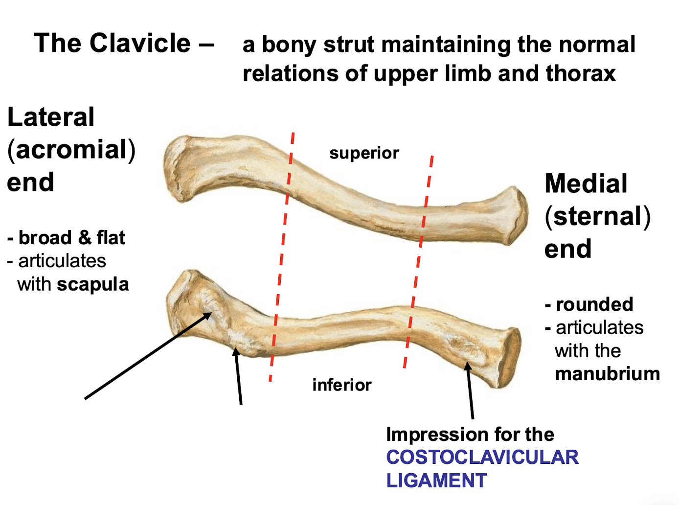 The medial (sternal) end is rounded and articulates with the manubrium; the lateral (acromial) end is broad and flat and articulates with the scapula