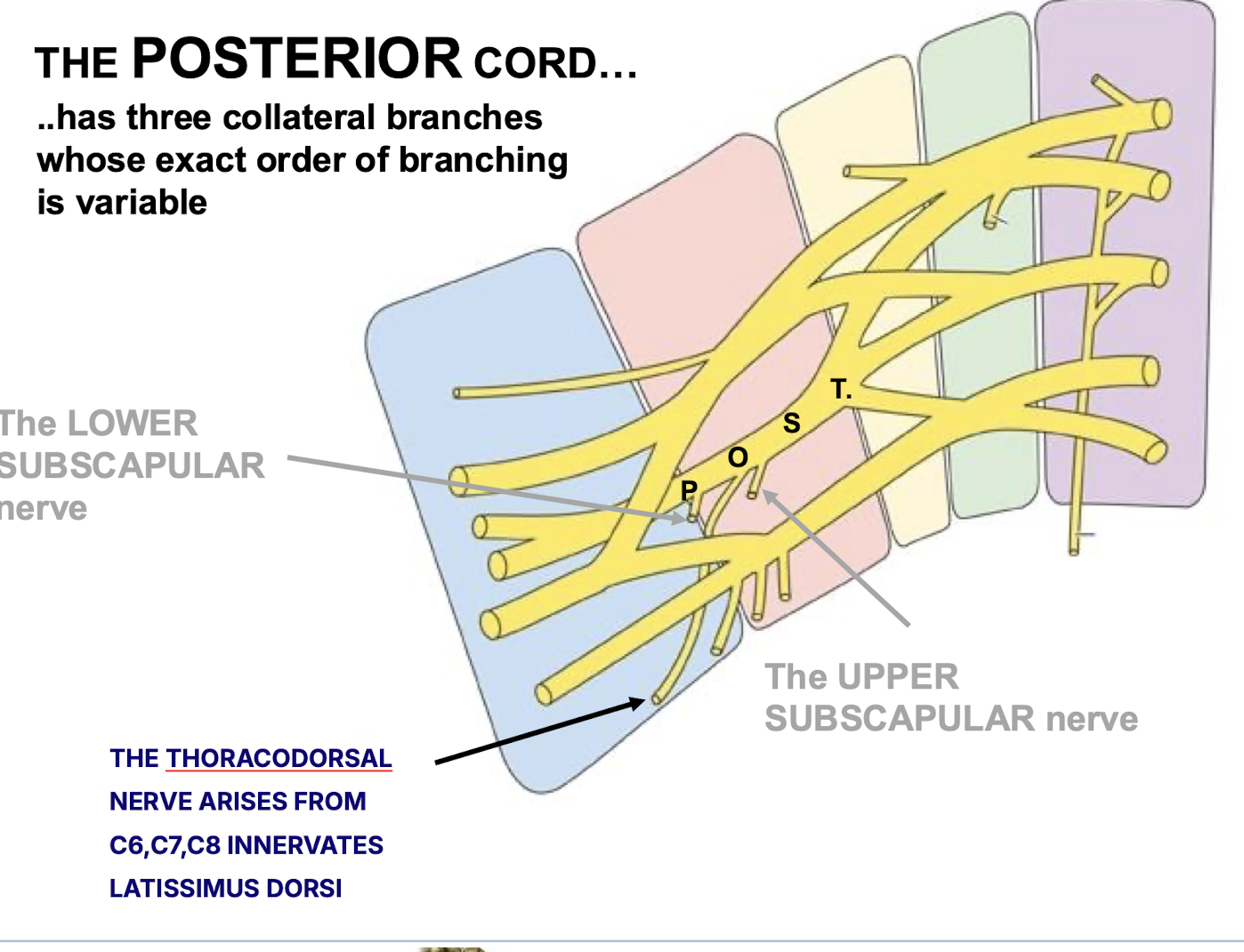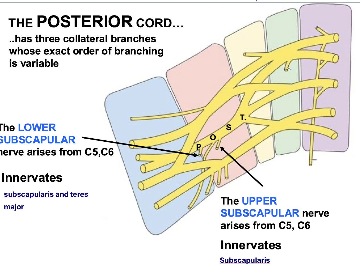 The upper subscapular (C5,C6), lower subscapular (C5,C6) and thoracodorsal (C6,C7,C8) nerves.