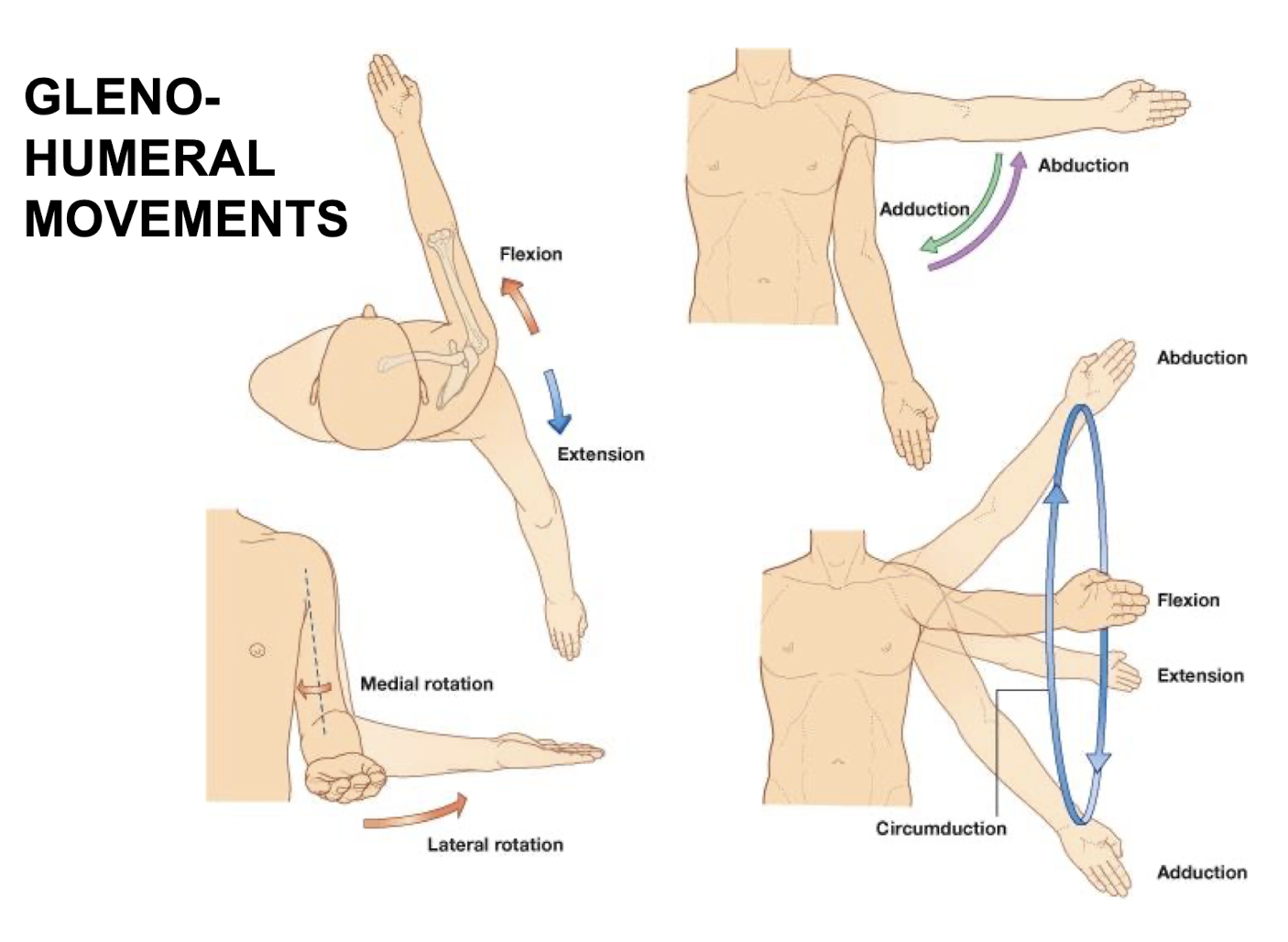 Flexion, extension, abduction, adduction, medial/lateral rotation, and circumduction.