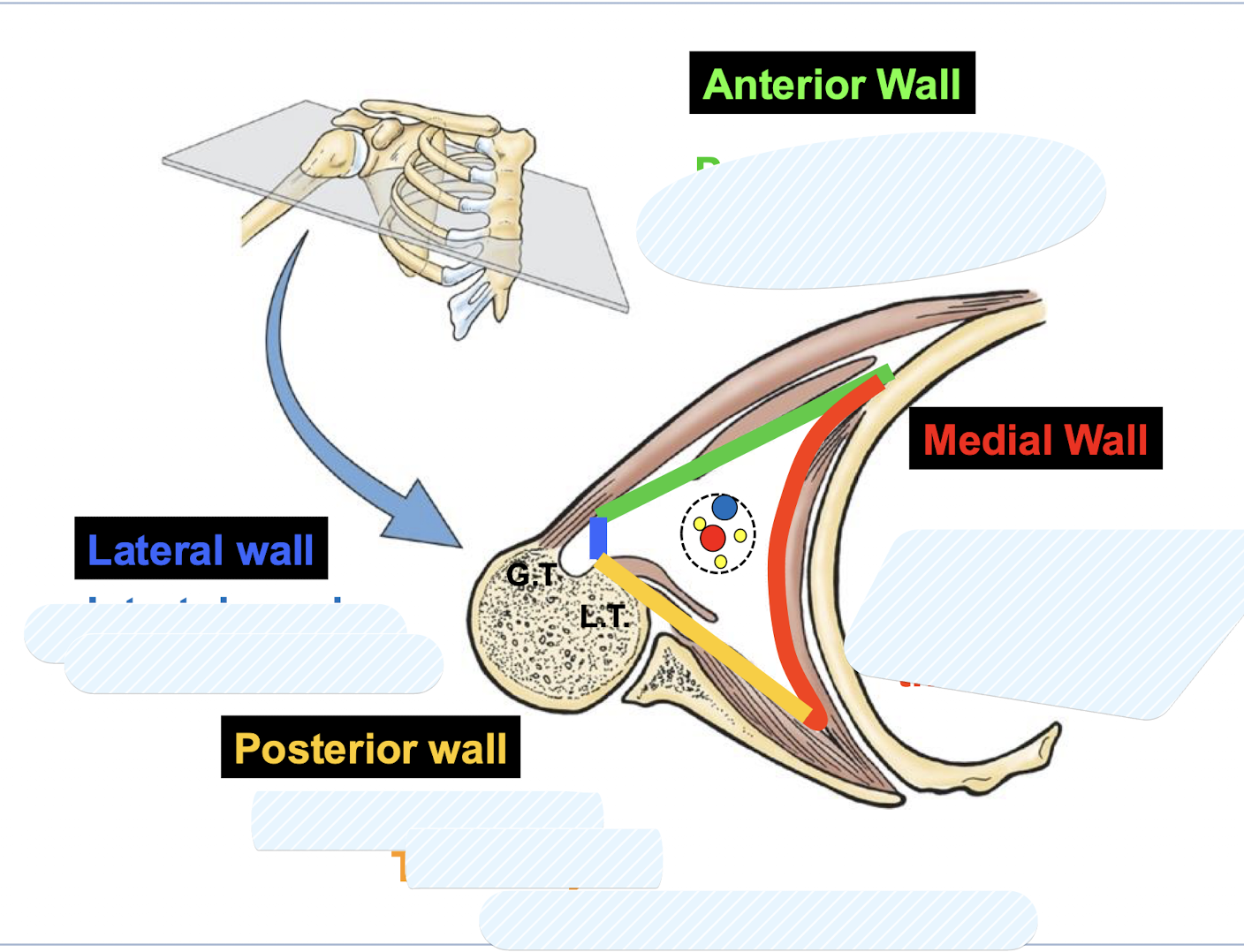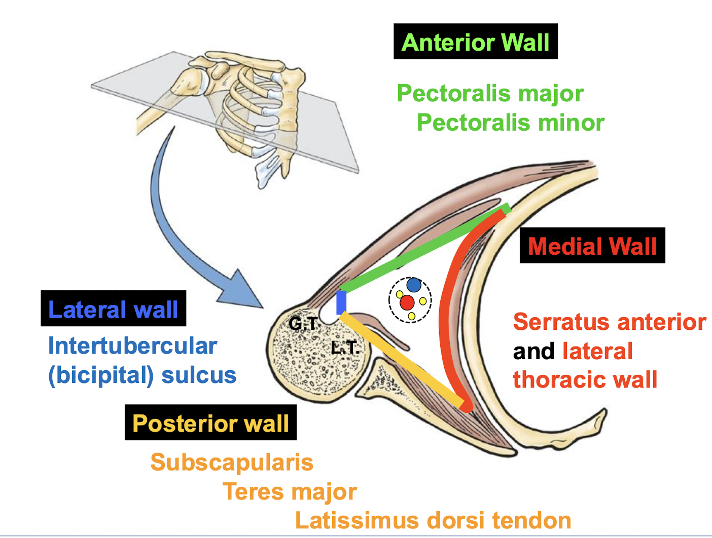 Anterior (pectoralis major and minor), Medial (serratus anterior/lateral ribcage), Lateral (intertubercular sulcus), and Posterior (subscapularis, teres major, latissimus dorsi tendon).